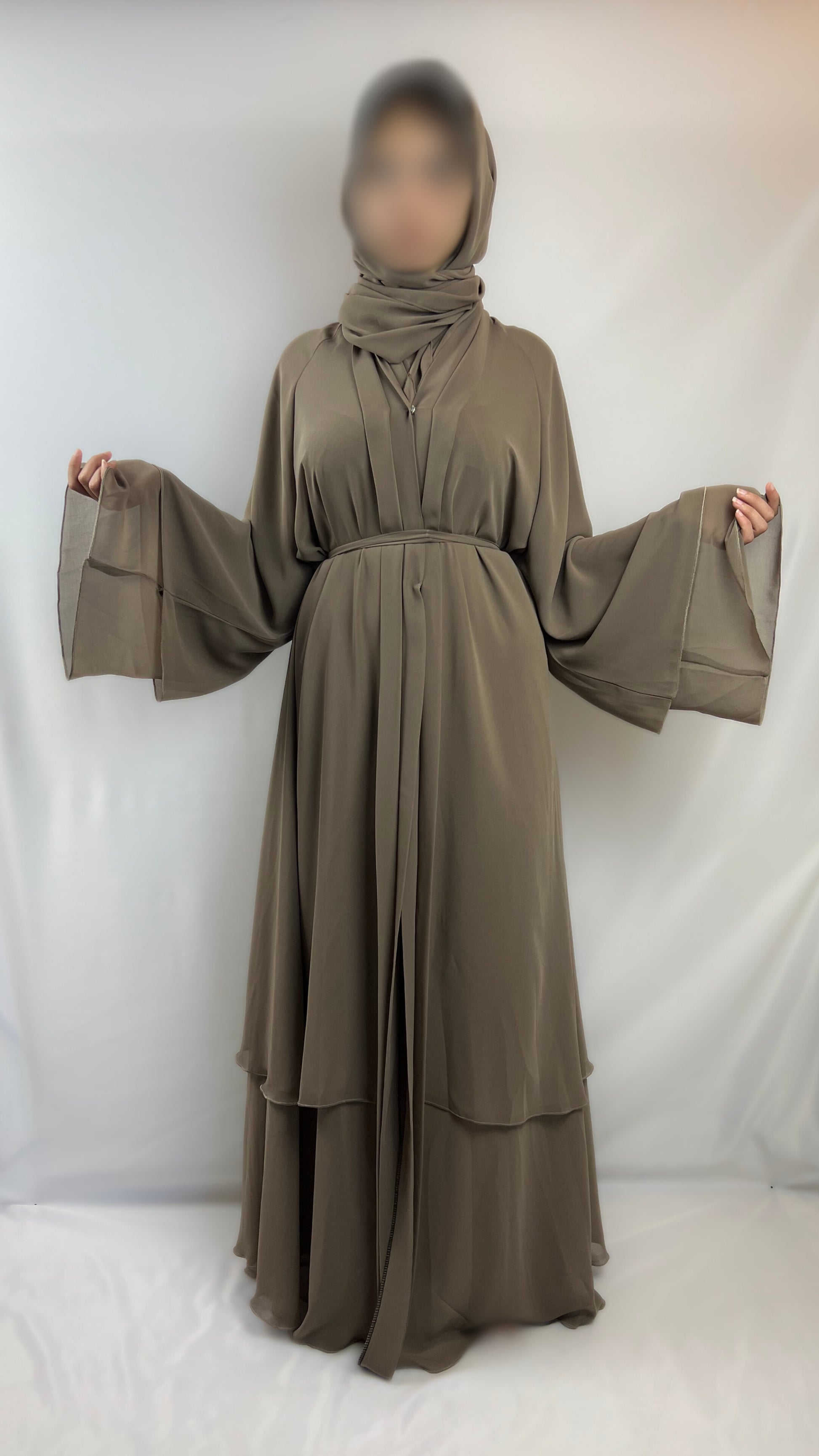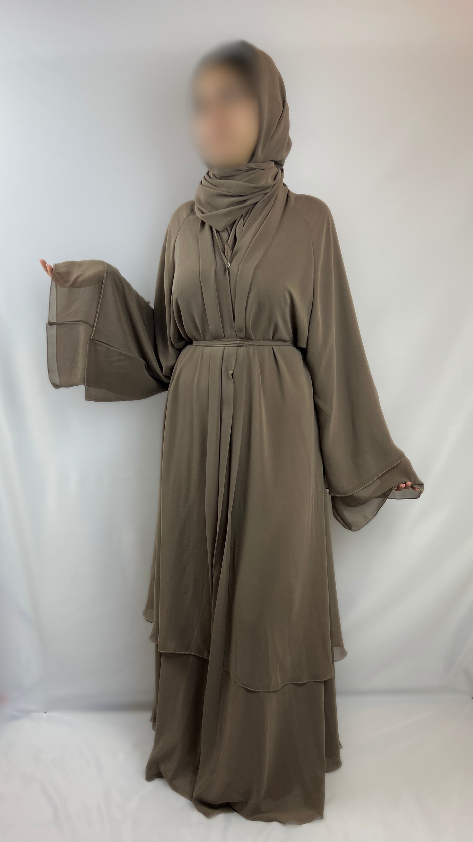 Découvrez notre élégante abaya volante en mousseline, conçue pour vous offrir un style chic et aérien. Fabriquée à partir de mousseline légère, cette abaya vous assure confort et fluidité, parfaite pour toutes les occasions spéciales.
